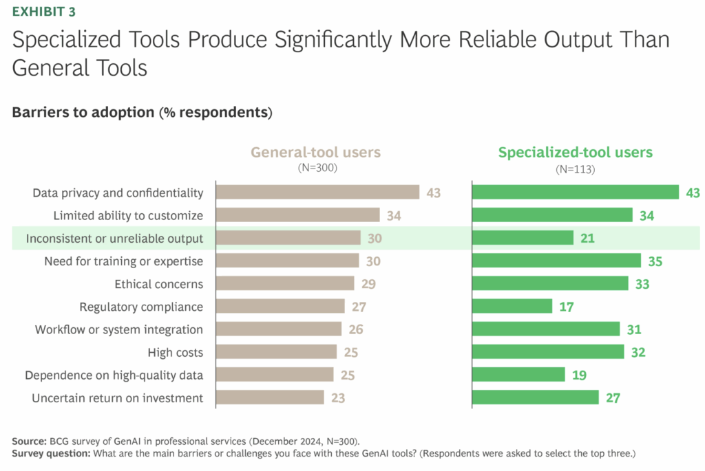 BCG의 조사 결과에 따르면, 특화된 도구는 거의 모든 측면에서 범용 GenAI보다 훨씬 뛰어난 성능을 보였습니다. 단순한 시간 절약뿐만 아니라 정확성, 범위, 통찰의 깊이에서도 우위를 보였습니다.