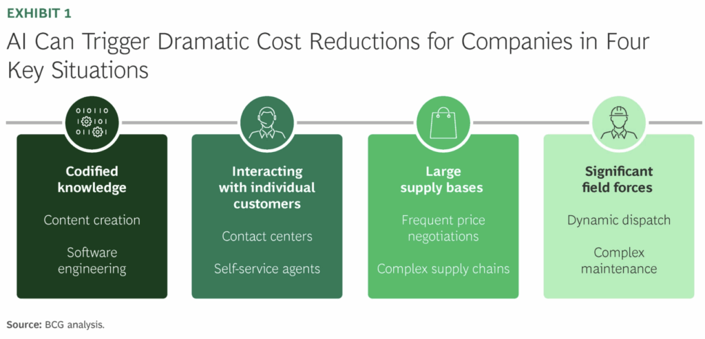 - AI는 다음 네 가지 주요 조건에서 가장 큰 비용 절감 효과를 발휘합니다. 정형화된 지식에 대한 높은 의존도, 고객과의 대량 상호작용, 방대한 공급망, 현장에서 활동하는 유지보수 또는 영업 인력이 많은 경우입니다.