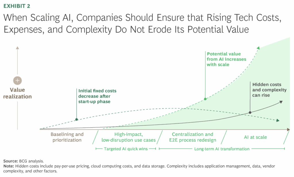 실제로, 향후 18개월 내 AI에 투자할 계획이라고 밝힌 경영진은 93%에 달하지만, BCG의 '비용 및 성장 가이드(Guide to Cost and Growth)'에 따르면 비용 절감 목표를 달성한 기업은 절반에 불과합니다.