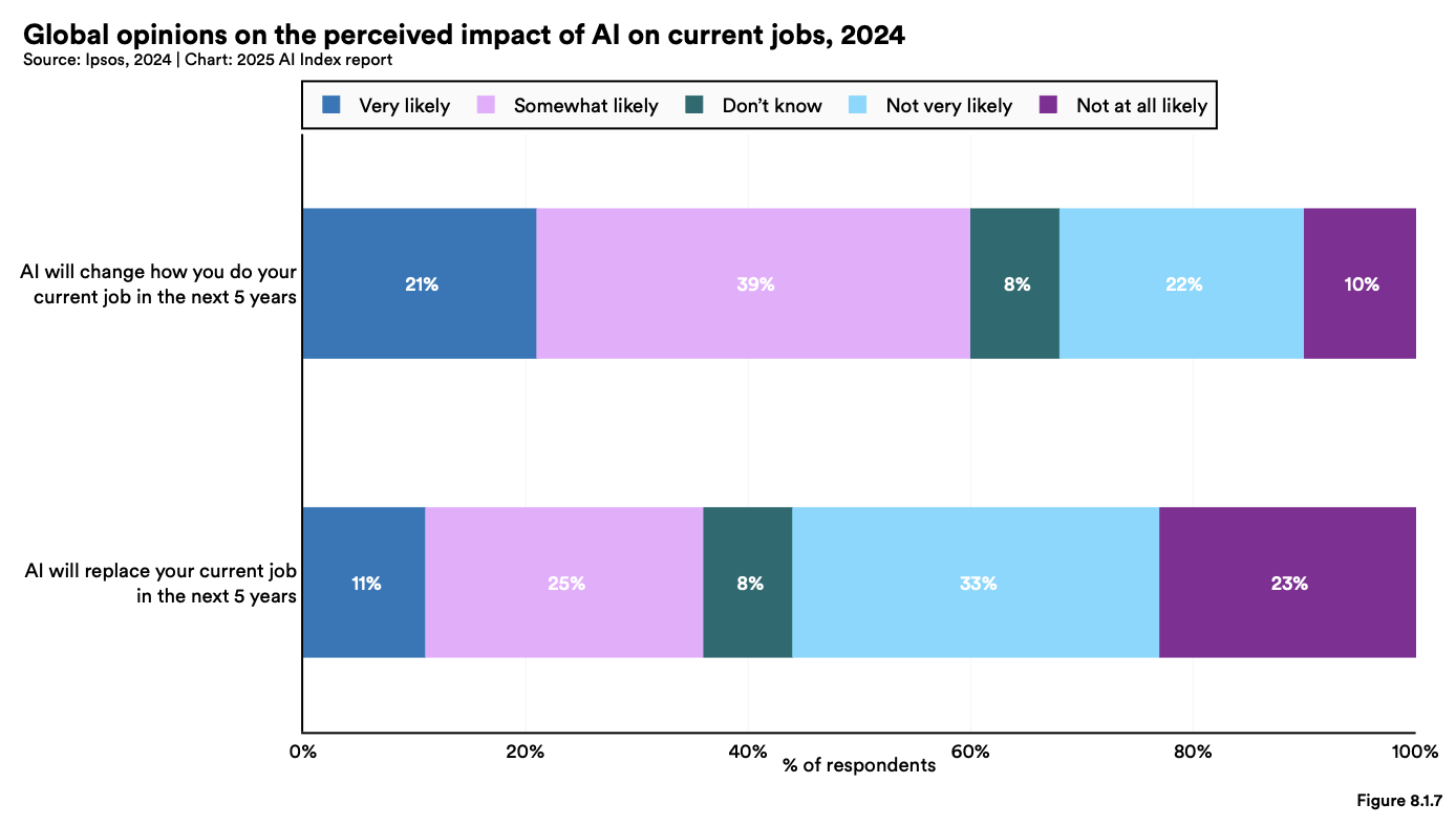 노동자들은 AI가 향후 일자리를 재편할 것이라 예상하지만, 직무 대체에 대한 두려움은 비교적 낮은 편입니다.
