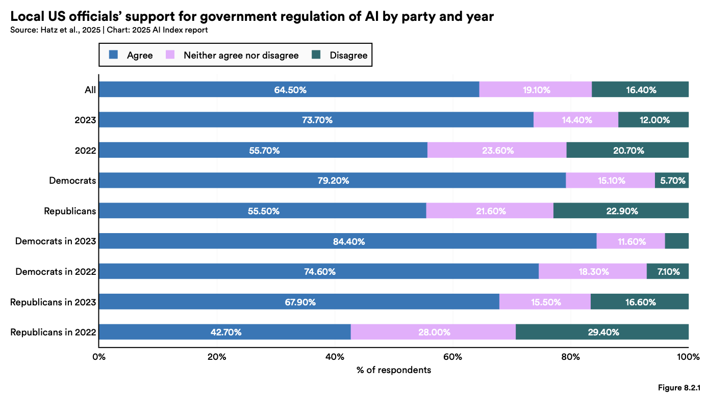2023년 기준, 미국 내 지역 정부 수준의 정책 입안자 중 73.7%가 AI 규제에 동의했으며, 이는 2022년의 55.7%에서 크게 증가한 수치입니다.