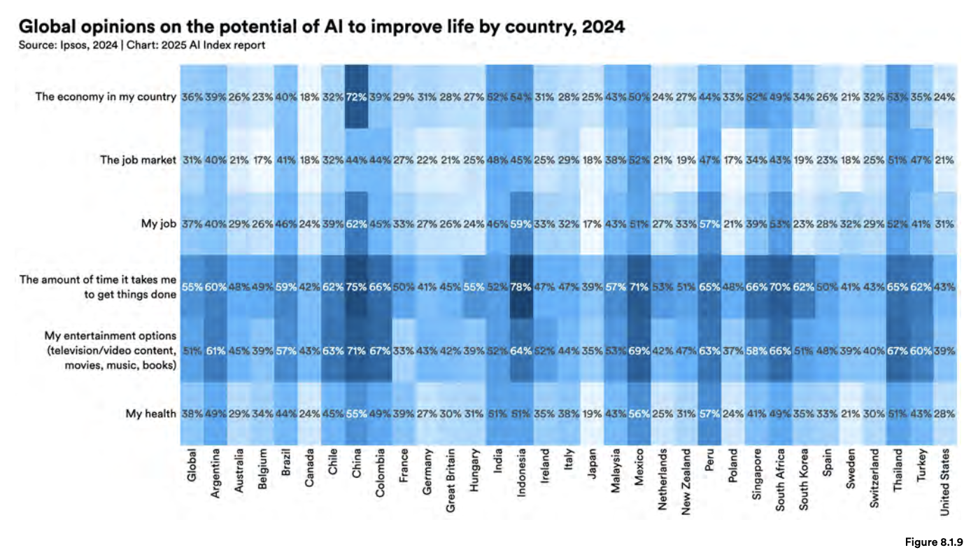 AI에 대한 낙관론은 지역별로 여전히 큰 차이를 보이고 있습니다.