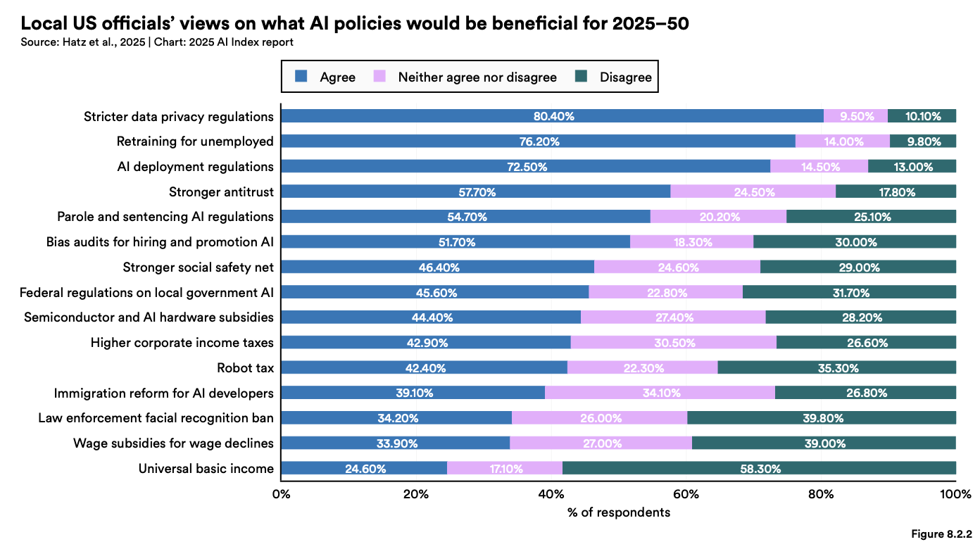 데이터 프라이버시 강화(80.4%), 실업자 재교육(76.2%), AI 배치 관련 규제(72.5%)는 높은 지지를 받았지만, 사법기관의 안면 인식 기술 사용 금지(34.2%), 임금 하락에 대한 보조금 지급(32.9%), 기본소득 도입(24.6%)에 대한 지지는 상대적으로 낮았습니다.