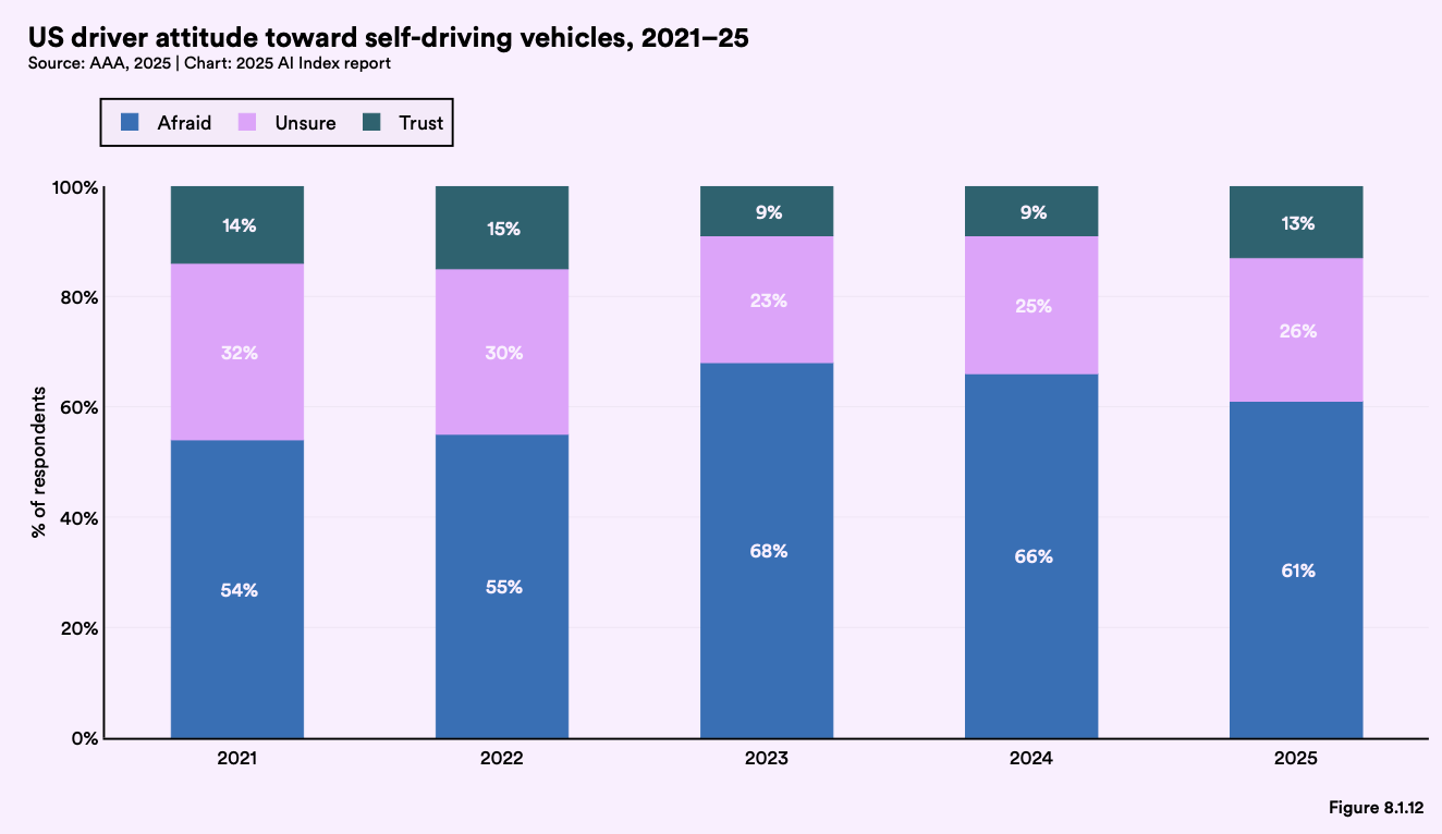 최근 미국자동차협회(AAA)의 조사에 따르면, 미국인의 61%가 자율주행차에 대해 두려움을 느끼고 있으며, 신뢰한다고 응답한 비율은 단 13%에 불과했습니다.