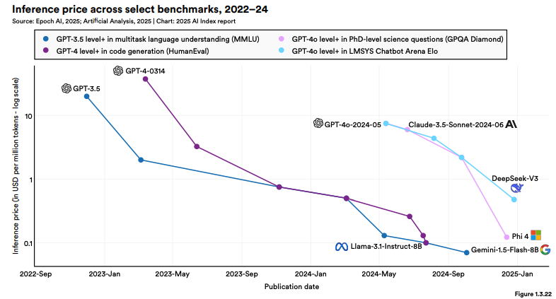 성능이 뛰어난 소형 모델들이 등장하면서 GPT-3.5 수준의 성능을 내는 시스템의 추론 비용은 2022년 11월부터 2024년 10월 사이에 280배 이상 감소했습니다.