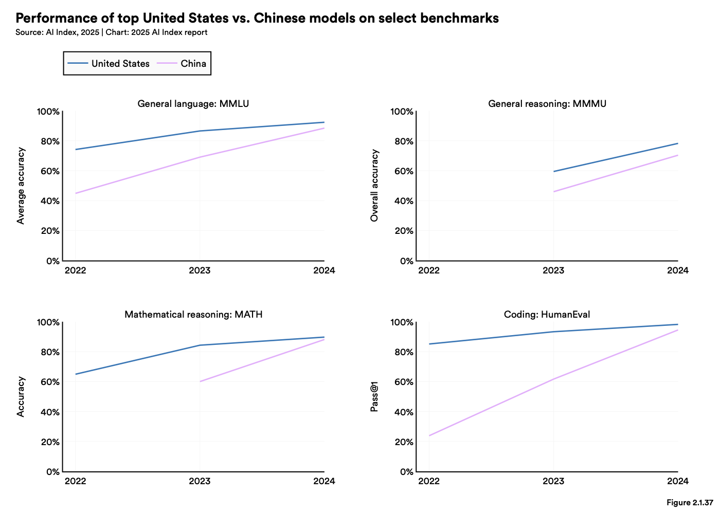 미국은 여전히 최고 수준의 AI 모델을 가장 많이 개발하고 있지만, 중국이 그 격차를 빠르게 좁히고 있습니다.