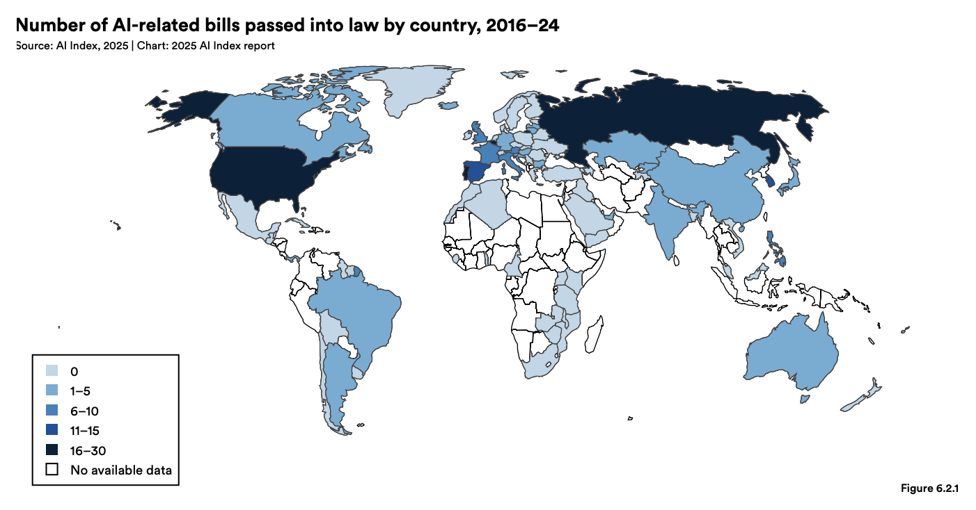 세계적으로는 75개국에서 AI 관련 법안 언급이 2023년 이후 21.3% 증가했으며, 이는 2016년 대비 9배 증가한 수치입니다. 이와 함께, 정부들은 대규모 투자를 이어가고 있습니다.