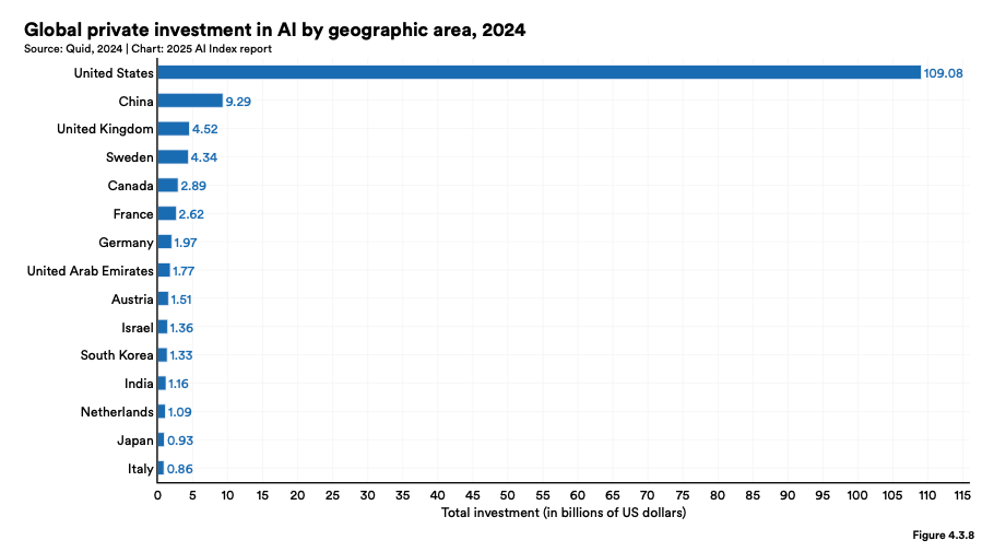 2024년, 미국의 민간 AI 투자 규모는 1,091억 달러(151조 원)로, 중국의 약 12배, 영국의 24배에 달했습니다.