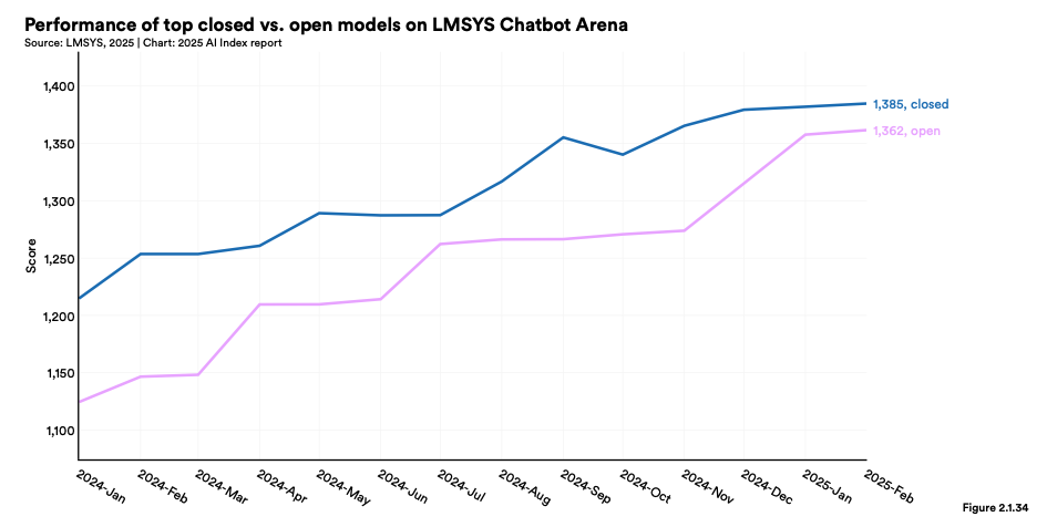 공개 가중치(open-weight)를 사용하는 모델은 비공개 모델과의 성능 격차를 빠르게 줄이고 있으며, 일부 벤치마크에서는 단 1년 만에 그 차이가 8%에서 1.7%로 좁혀졌습니다.