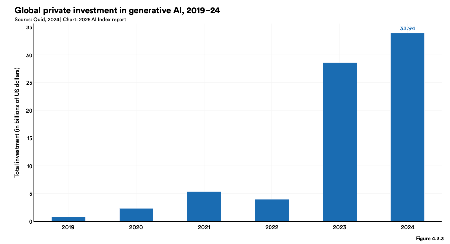 생성형 AI 분야는 특히 활발하여 전 세계적으로 339억 달러의 민간 투자를 유치했으며, 이는 2023년 대비 18.7% 증가한 수치입니다.