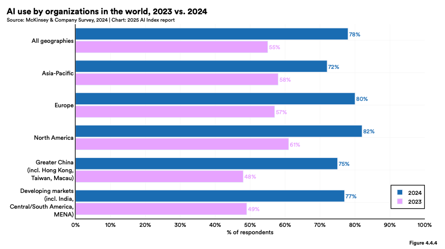 AI의 기업 활용도는 빠르게 증가 중으로, 2024년에는 78%의 조직이 AI를 사용하고 있다고 보고했으며, 이는 전년의 55%에서 크게 상승한 수치입니다.