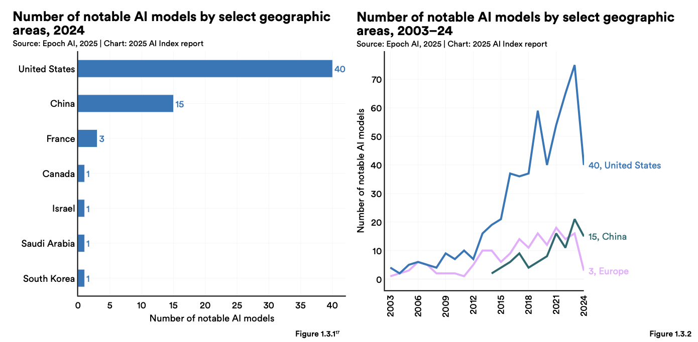 미국은 여전히 최고 수준의 AI 모델을 가장 많이 개발하고 있지만, 중국이 그 격차를 빠르게 좁히고 있습니다.