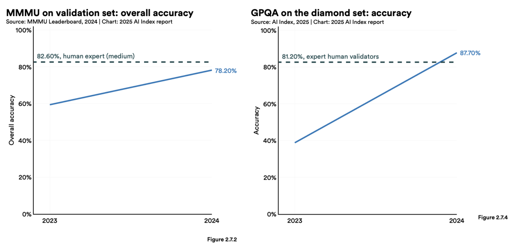 2023년, 연구진은 고성능 AI 시스템의 한계를 시험하기 위해 MMMU, GPQA, SWE-bench라는 새로운 벤치마크를 도입했습니다. 불과 1년 만에 성능은 급격히 향상되어, MMMU는 18.8포인트, GPQA는 48.9포인트, SWE-bench는 무려 67.3포인트 상승했습니다.