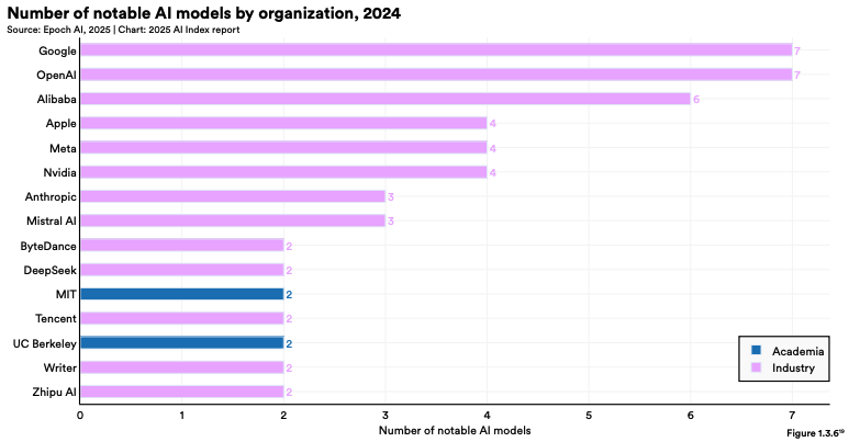 산업계는 AI 분야에서 앞서 나가고 있지만, 선두권의 경쟁은 점점 치열해지고 있습니다.