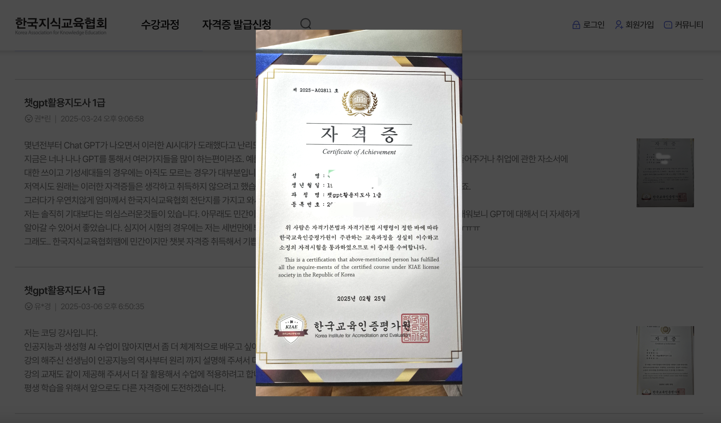※ 한국지식교육협회의 지원을 절대 받지 않았으며, 너무 무료로 좋은 강의와 자격증을 얻을 수 있는 기회라서 소개해 드립니다.