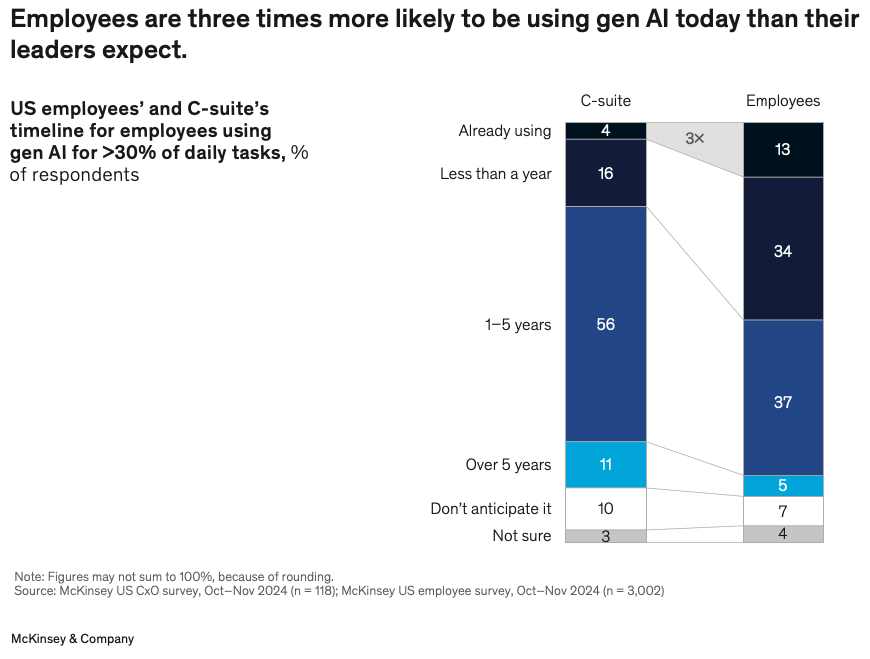 2장은 직원과 리더가 AI를 어떻게 바라보는지에 초점을 맞춥니다. 맥킨지의 조사에 따르면, 직원들은 리더들이 생각하는 것보다 훨씬 더 자주 AI를 사용하고 있고, AI가 앞으로 1년 안에 자신의 업무 중 30%를 대체할 것이라고 믿는 비율도 3배 이상 높습니다.