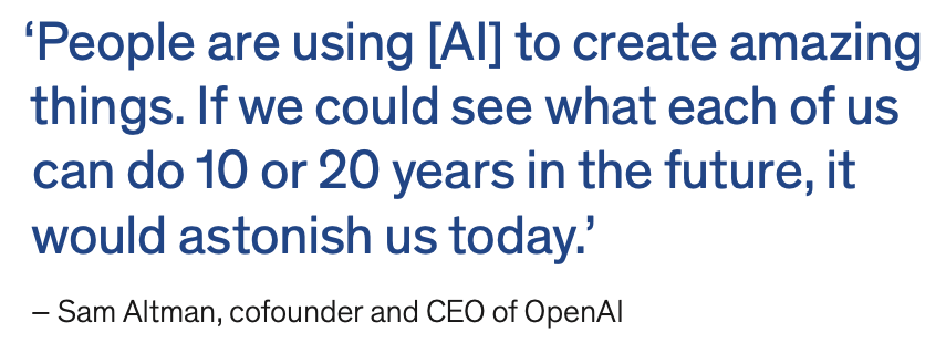 "사람들은 [AI]를 사용해 놀라운 것들을 만들어내고 있습니다. 지금 우리가 각자 10년, 20년 후에 무엇을 할 수 있을지 볼 수 있다면, 우리는 지금 충격을 받을 것입니다." _ 샘 알트만, OpenAI 공동창업자 & CEO