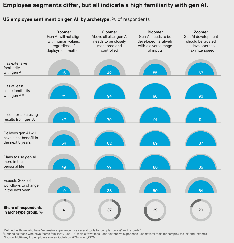 직원들은 AI 도구에 익숙하고, 더 많은 지원과 교육을 원하며, 가까운 미래에 AI가 자신의 업무 중 최소 3분의 1을 대체할 것이라 믿는 경향도 더 큽니다.