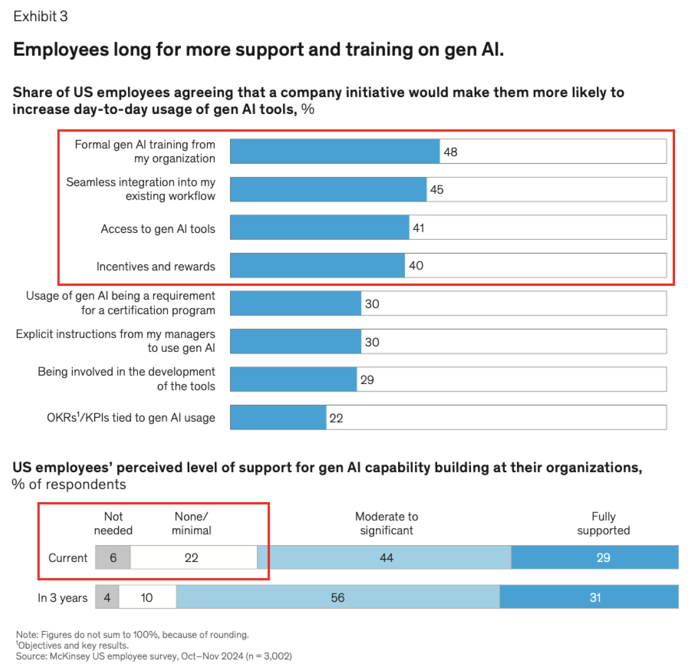응답자의 절반 가까이는 더욱 체계적인 교육을 원하며, 그것이 AI 도입을 가속화하는 가장 좋은 방법이라 믿고 있습니다.