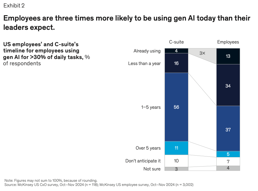 C레벨 리더들은 단지 4%의 직원만이 하루 업무의 30% 이상에 AI를 사용하고 있다고 추정했지만, 실제로는 이 수치의 3배에 달하는 직원들이 그렇다고 답했습니다(Exhibit 2 참고).