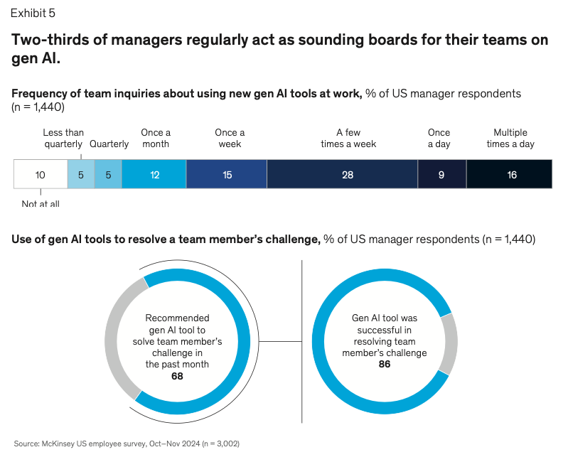 관리자의 3분의 2는 팀원들로부터 AI 도구 사용법에 대한 질문을 최소 주 1회 이상 받고 있다고 답했으며, 이와 비슷한 비율로 AI 도구를 문제 해결 수단으로 팀에 추천하고 있다고 응답했습니다(Exhibit 5 참조).
