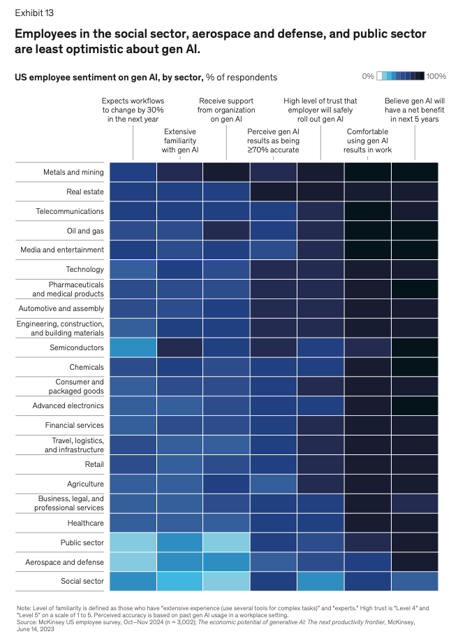공공 부문, 항공우주 및 방위산업, 반도체 산업의 직원들은 AI 발전에 대해 회의적인 입장을 보이고 있습니다.