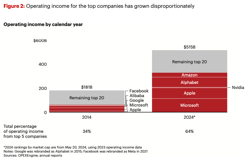 이들 기업은 전체 이익의 64%를 창출하고 있는데, 이는 10년 전의 34% 대비 거의 두 배에 달하는 수치입니다.