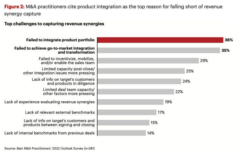 베인의 당사 조사에 따르면, 제품 포트폴리오 통합 실패는 수익 시너지 실현에 있어 가장 흔한 장애물로 지목되고 있습니다.
