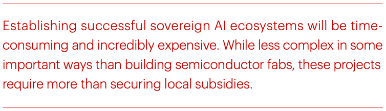 성공적인 주권형 AI 생태계를 조성하는 데는 막대한 시간과 비용이 소요될 것으로 예상됩니다. 반도체 공장 건설보다는 덜 복잡할 수 있으나, 단순히 정부 보조금만으로는 충분하지 않습니다.