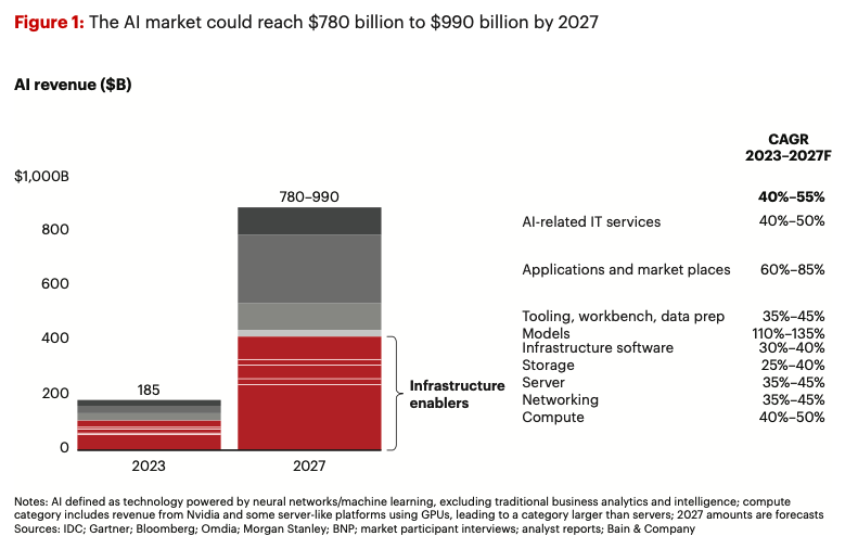 베인은 AI 관련 하드웨어 및 소프트웨어의 총 시장 규모가 향후 최소 3년간 연평균 40~55% 성장해 2027년까지 7,800억~9,900억 달러에 이를 것으로 추정합니다. 공급과 수요의 불균형이 중간에 변동성을 유발할 수 있지만, 장기적이고 견고한 성장 흐름은 지속될 것으로 보입니다.