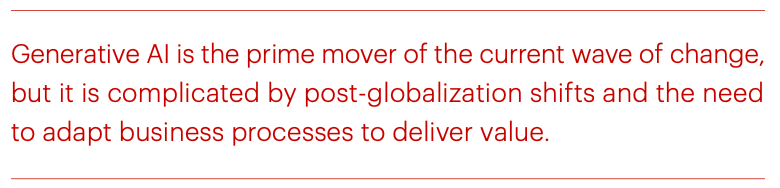 생성형 AI는 현재 변화의 흐름을 주도하는 핵심 동력이지만, 탈세계화 이후의 전환과 가치를 제공하기 위한 비즈니스 프로세스 적응의 필요성으로 인해 그 복잡성이 더해지고 있습니다.