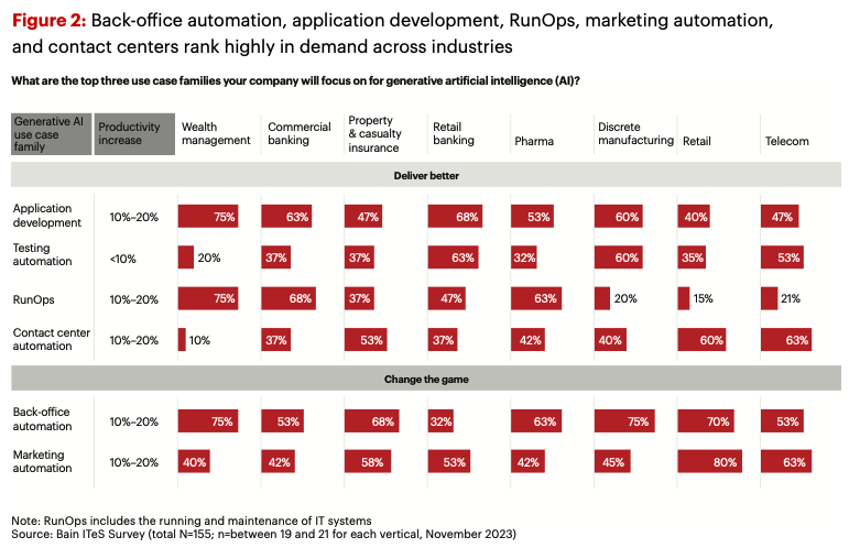 베인앤컴퍼니의 최근 글로벌 조사에 따르면, 응답자의 85%가 생성형 AI를 5대 우선 순위 중 하나로 꼽았으며, 2023년에는 20% 미만이었던 500만 달러 이상을 투자하겠다는 기업 비율이 2024년에는 33%로 증가할 전망입니다.