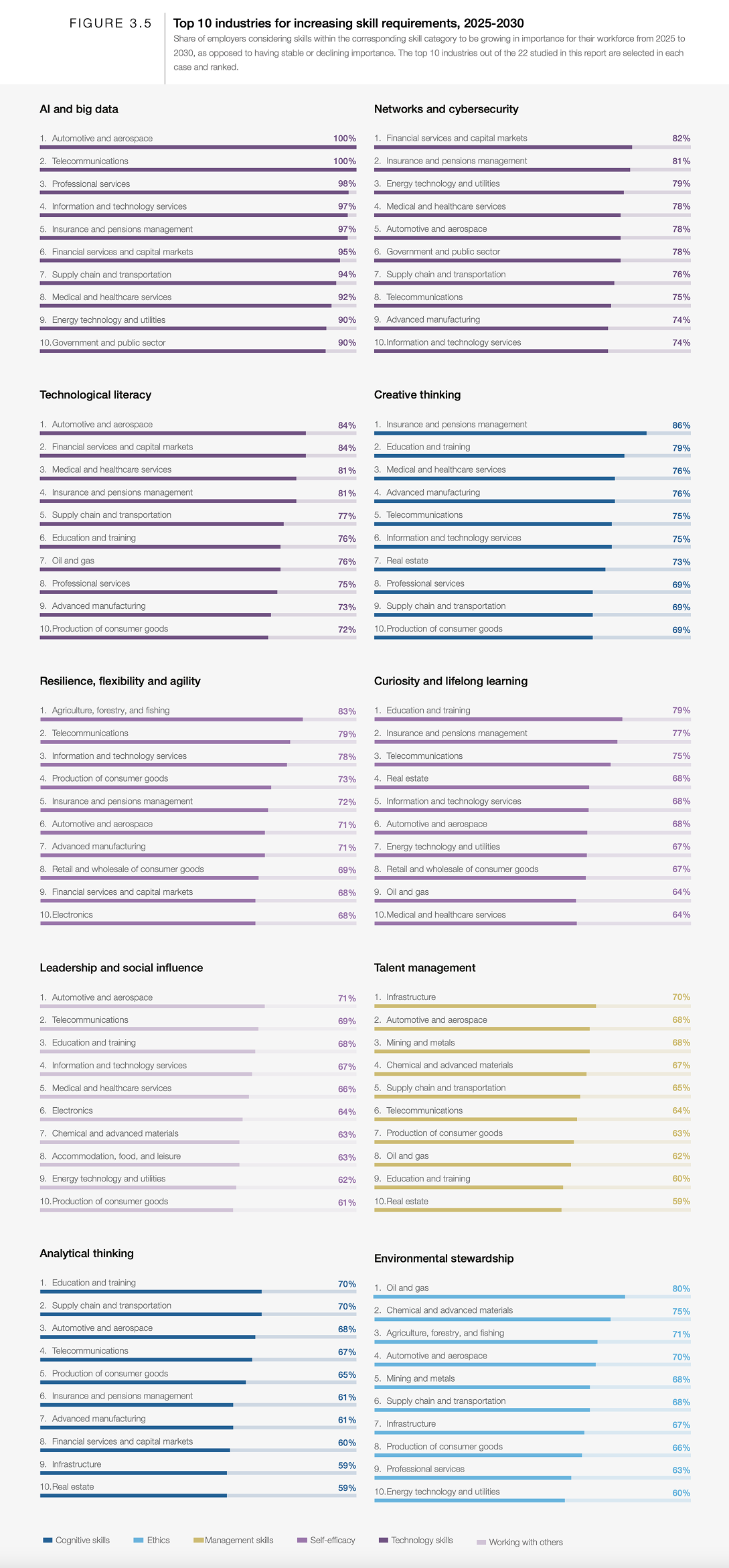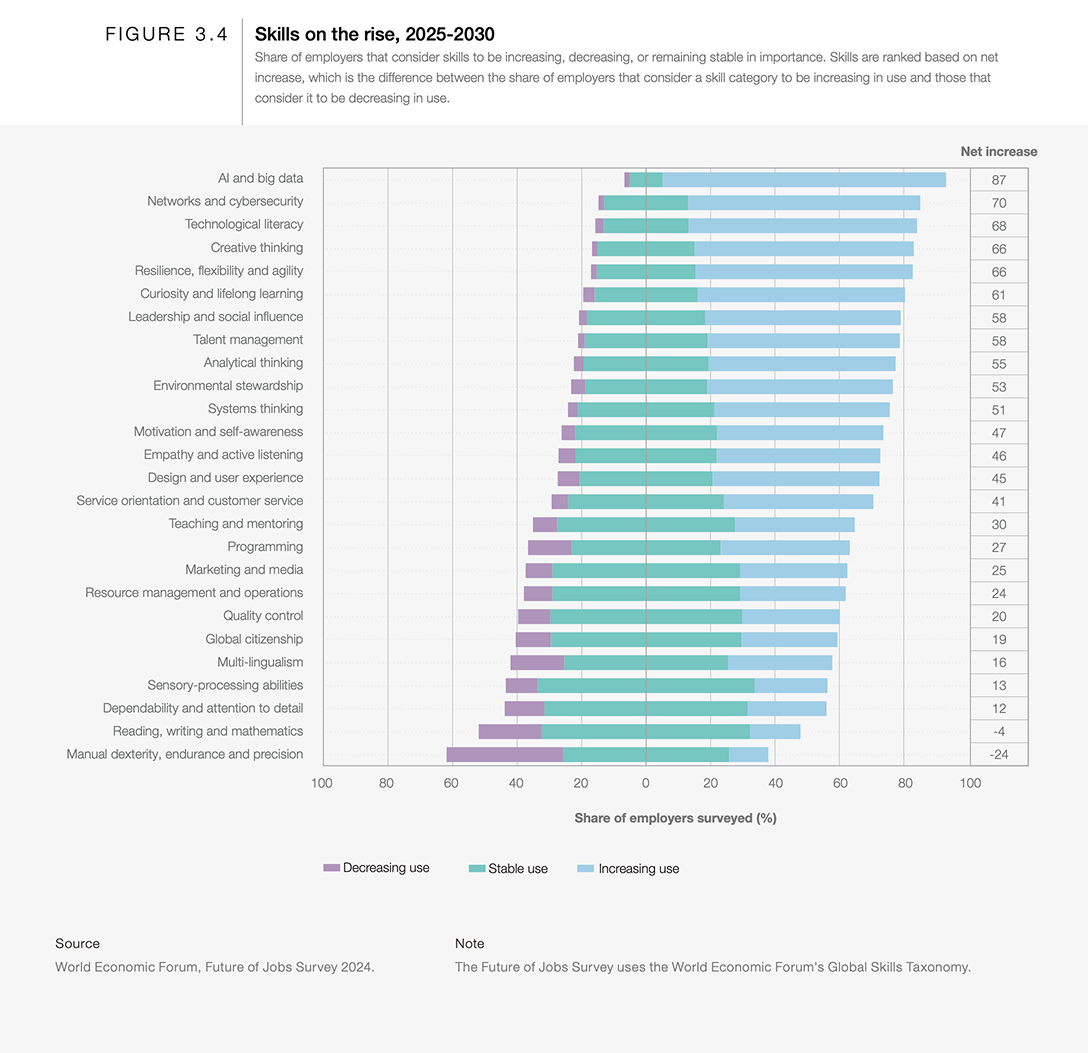 한편, 반대편에서는 감각 처리 능력, 읽기·쓰기·수학, 신뢰성 및 세부사항에 대한 주의력, 품질 관리, 글로벌 시민의식이 가장 안정적인 기술로 분류되었습니다. 그럼에도 불구하고, 읽기·쓰기·수학 능력은 소폭의 순 감소가 예상되며, 수작업 능력·인내력·정밀성은 눈에 띄는 순감소가 예측되는데, 응답자의 24%는 이 역량의 중요성이 줄어들 것이라고 예상했습니다.
