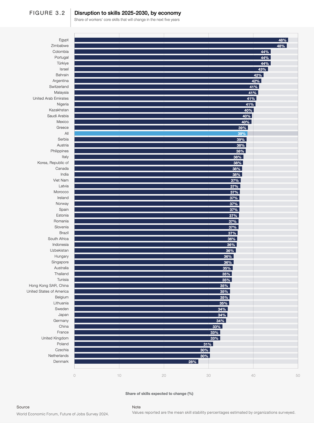 다만 역량 변화의 강도는 국가와 산업에 따라 다릅니다. 중하위 및 상위 중위소득 국가들과 분쟁 영향을 받는 지역에서는 근로자의 역량 변화가 더 클 것으로 예상하는 반면, 고소득 국가에서는 역량 불안정성이 상대적으로 낮을 것으로 전망되고 있습니다. (Figure 3.2 참고)