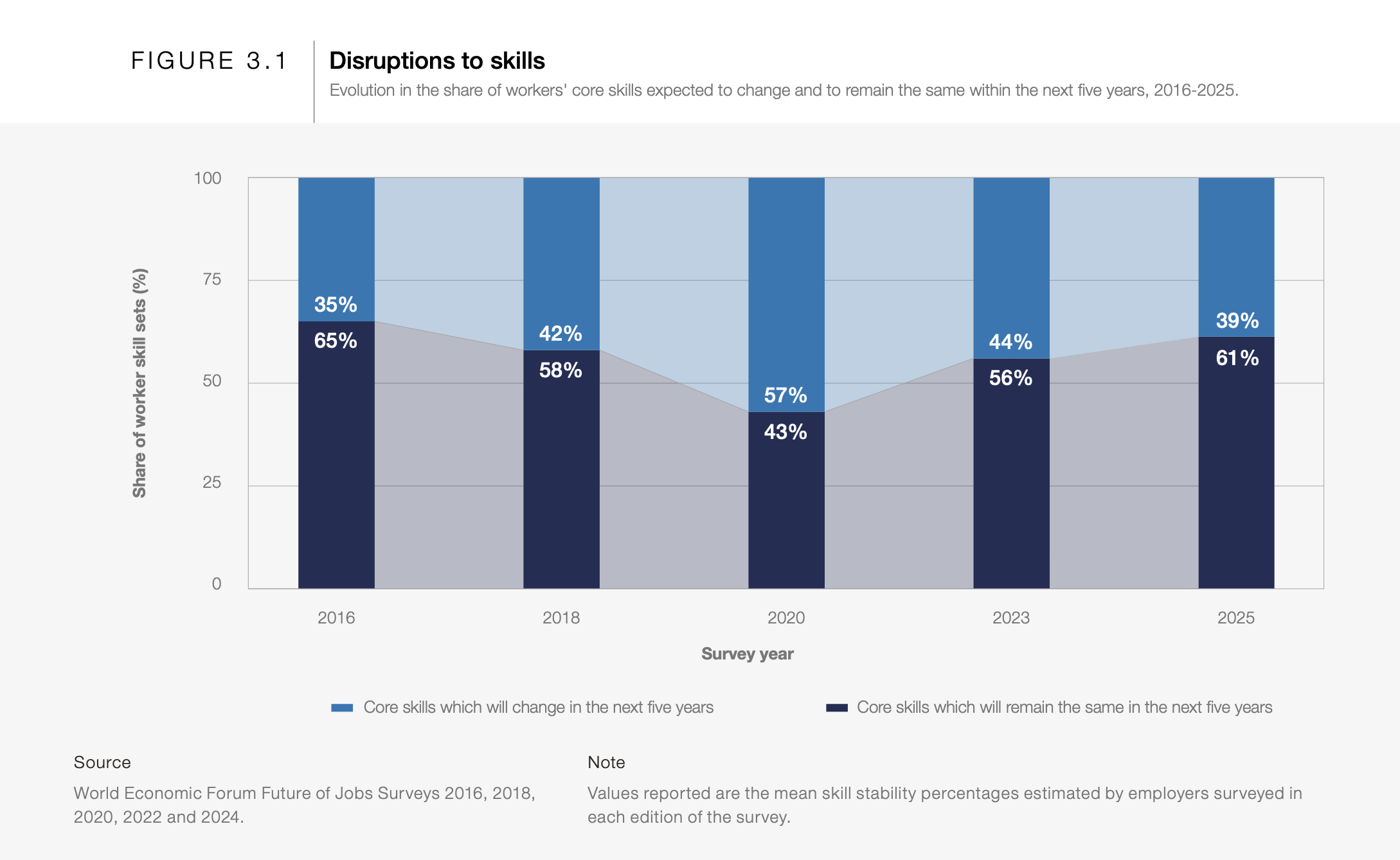 『미래 일자리 보고서(The Future of Jobs)』가 처음 발간된 2016년 당시, 조사에 응한 고용주들은 근로자 역량 중 35%가 향후 변화에 직면할 것으로 예상했습니다.