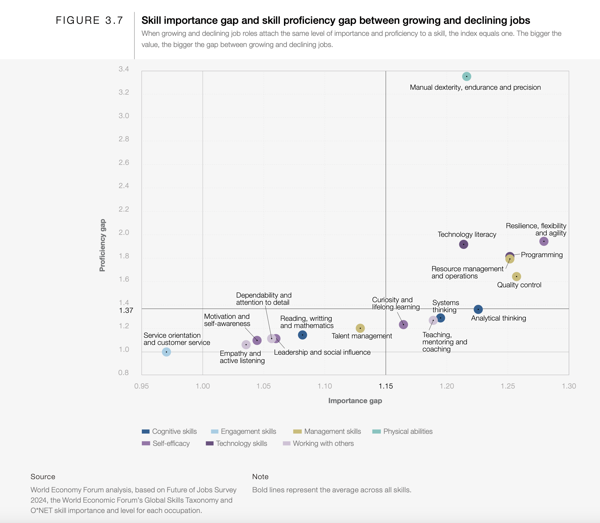 수작업 기술, 인내력, 정밀성(Manual dexterity, endurance and precision)은 중요도보다는 숙련도 측면에서 큰 차이를 보입니다. 이는 수작업 역량이 여전히 중요한 직무의 경우, 기업들이 기술 문해력과 문제 해결 능력을 결합한 더 높은 수준의 전문성을 요구하고 있음을 의미합니다.