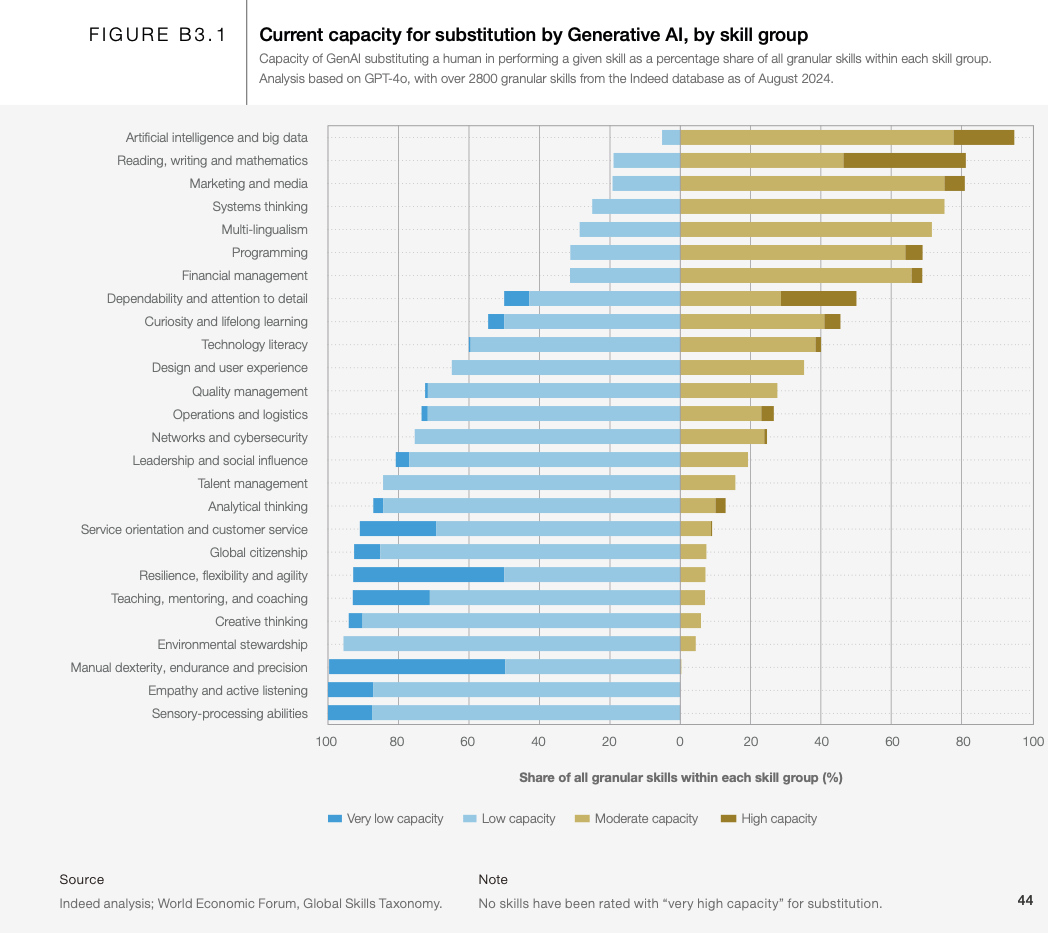 Figure B3.1은 GenAI가 특정 역량을 수행함에 있어 인간을 대체할 수 있는 정도를 나타낸 것으로, GPT-4o가 세 가지 영역에 걸쳐 스스로의 역량을 평가한 결과를 기반으로 합니다. 이 세 가지 영역은 해당 역량에 대한 이론적 지식 제공 능력, 해당 역량과 관련된 문제 해결 능력, 그리고 물리적 존재나 수작업 수행이 필요한지를 포함합니다. 이 도표는 세계경제포럼의 글로벌 역량 분류 체계에 따라 2,800개 이상의 세분화된 역량을 다섯 가지 대체 가능성 수준(매우 낮음, 낮음, 중간, 높음, 매우 높음)으로 평가합니다.