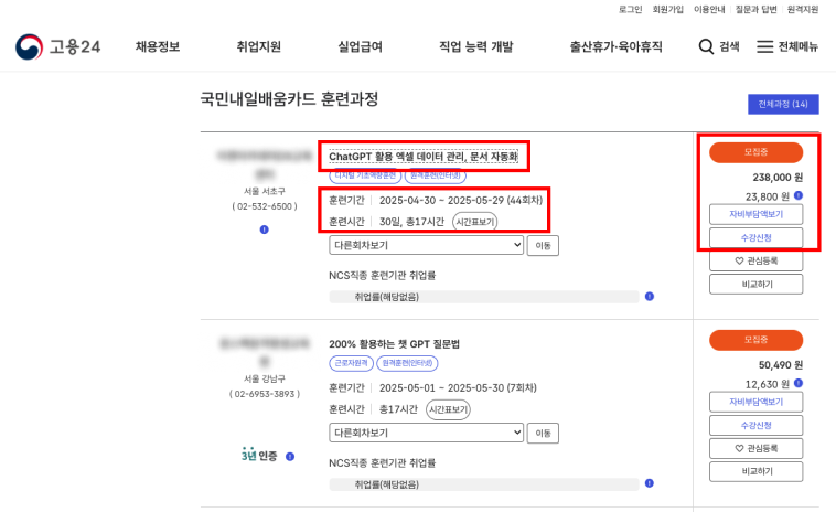 5. 검색 결과에서 과정명, 훈련 기간, 본인부담금 정보를 자세하게 확인 가능합니다
