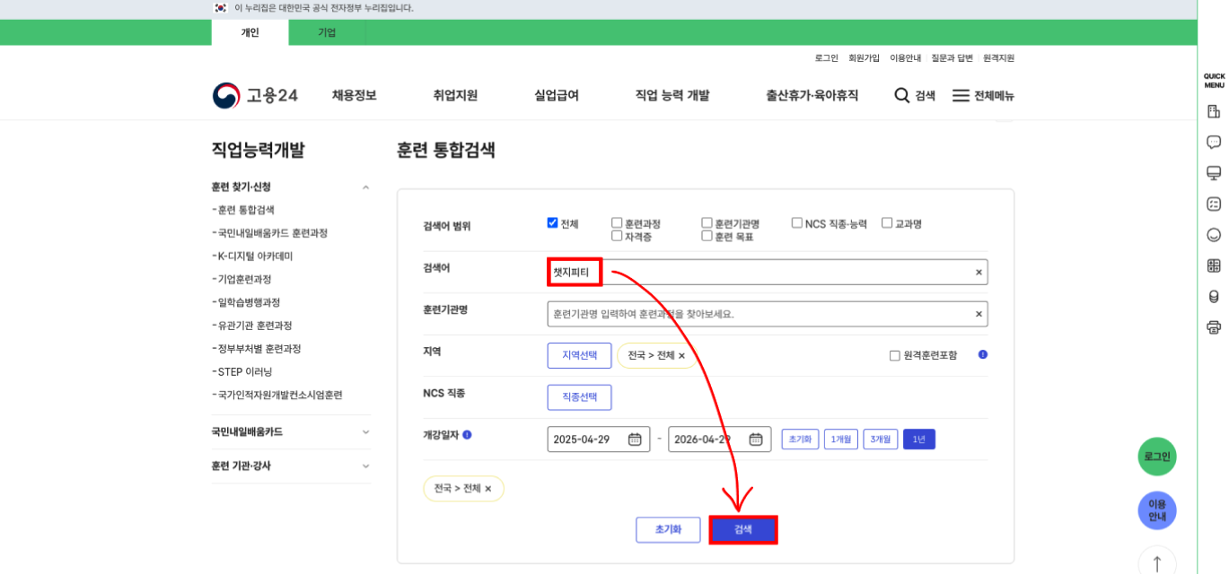 3. 관심 키워드를 입력 검색어 창에 입력하고 검색합니다 (예: 챗지피티, 요양보호사, 전기기능사 등)